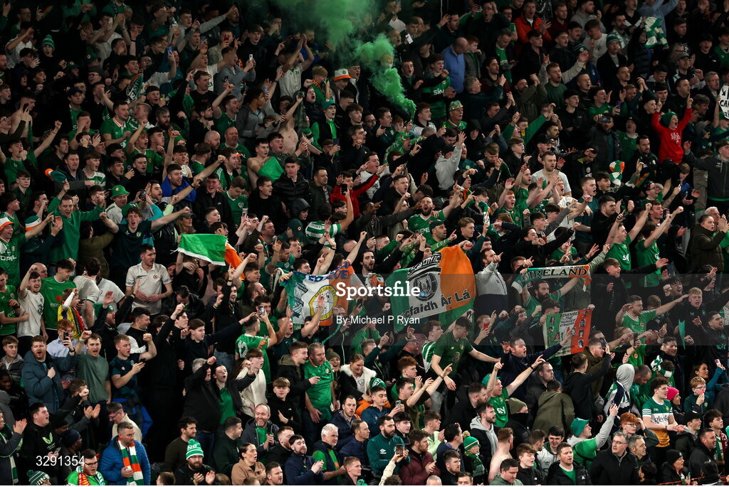 13 November 2025; Republic of Ireland supporters celebrate after the FIFA World Cup 2026 Group F Qualifier match between Republic of Ireland and Portugal at the Aviva Stadium in Dublin. Photo by Michael P Ryan/Sportsfile