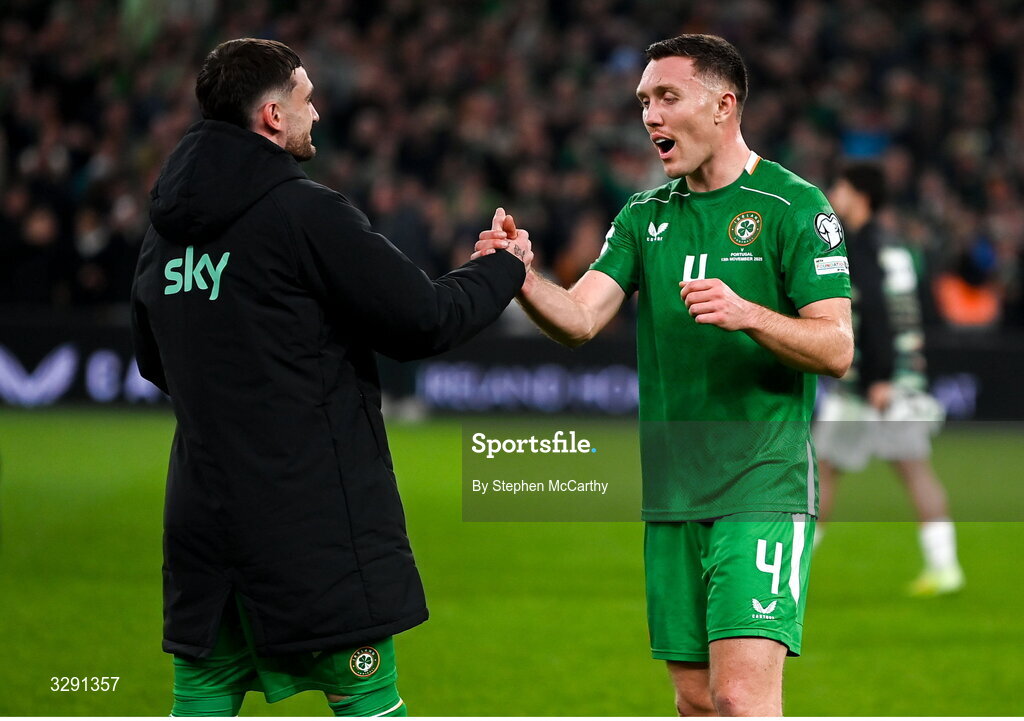 13 November 2025; Dara O'Shea, right, and Troy Parrott of Republic of Ireland celebrate after the FIFA World Cup 2026 Group F Qualifier match between Republic of Ireland and Portugal at the Aviva Stadium in Dublin. Photo by Stephen McCarthy/Sportsfile