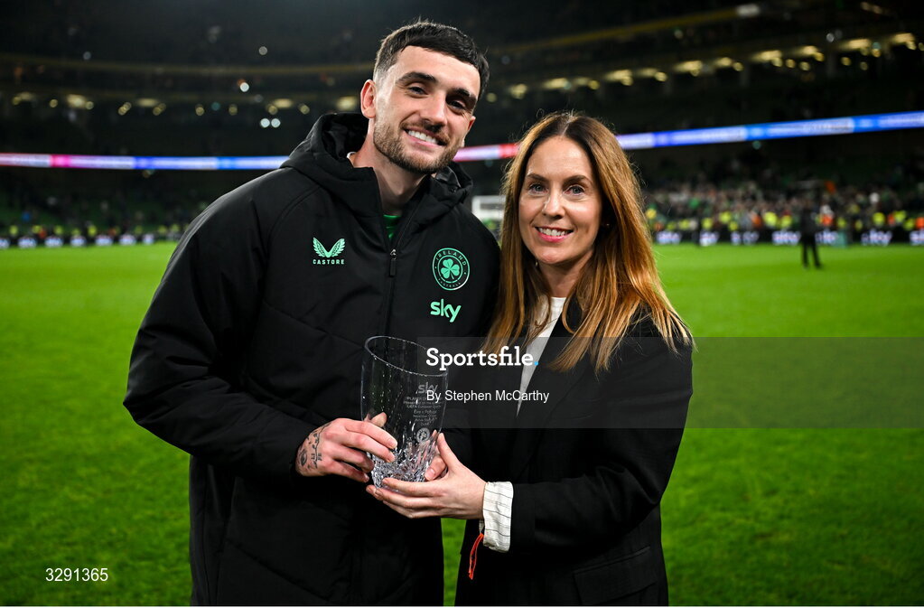 13 November 2025; Troy Parrott of Republic of Ireland is presented with the Man of the Match award by Caroline Donnellan, director of marketing and brand at Sky Ireland, after the FIFA World Cup 2026 Group F Qualifier match between Republic of Ireland and Portugal at the Aviva Stadium in Dublin. Photo by Stephen McCarthy/Sportsfile