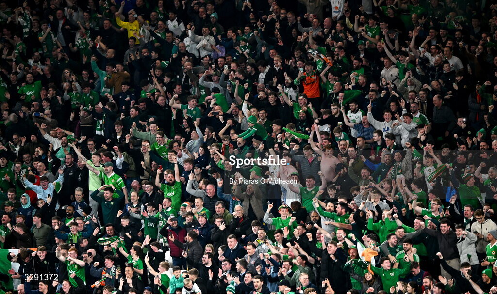 13 November 2025; Republic of Ireland supporters celebrate after the FIFA World Cup 2026 Group F Qualifier match between Republic of Ireland and Portugal at the Aviva Stadium in Dublin. Photo by Piaras Ó Mídheach/Sportsfile
