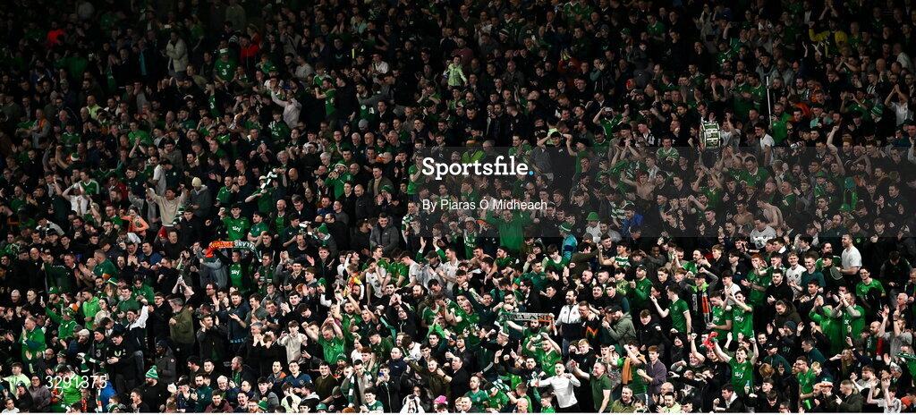 13 November 2025; Republic of Ireland supporters celebrate after the FIFA World Cup 2026 Group F Qualifier match between Republic of Ireland and Portugal at the Aviva Stadium in Dublin. Photo by Piaras Ó Mídheach/Sportsfile