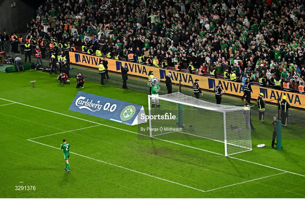 13 November 2025; Seamus Coleman of Republic of Ireland celebrates in front of supporters after victory in the FIFA World Cup 2026 Group F Qualifier match between Republic of Ireland and Portugal at the Aviva Stadium in Dublin. Photo by Piaras Ó Mídheach/Sportsfile