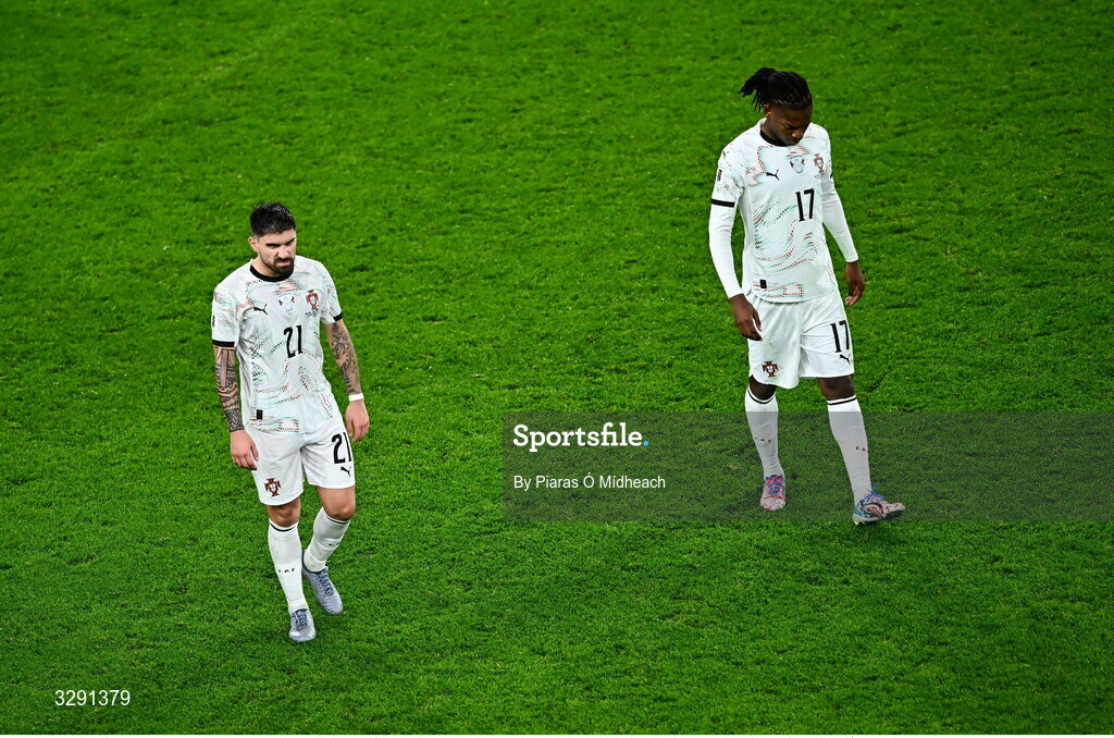 13 November 2025; Portugal players Rúben Neves, left, and Rafael Leao leave the pitch after their side's defeat in the FIFA World Cup 2026 Group F Qualifier match between Republic of Ireland and Portugal at the Aviva Stadium in Dublin. Photo by Piaras Ó Mídheach/Sportsfile
