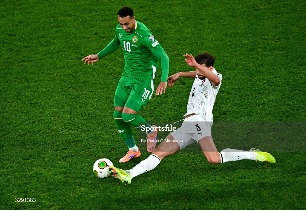 13 November 2025; Adam Idah of Republic of Ireland in action against Rúben Dias of Portugal during the FIFA World Cup 2026 Group F Qualifier match between Republic of Ireland and Portugal at the Aviva Stadium in Dublin. Photo by Piaras Ó Mídheach/Sportsfile
