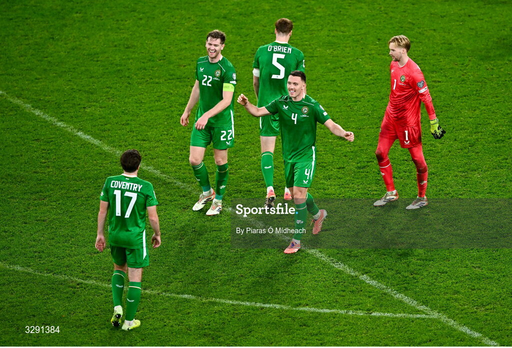 13 November 2025; Dara O'Shea of Republic of Ireland, 4, celebrates with team-mates after his side's victory in the FIFA World Cup 2026 Group F Qualifier match between Republic of Ireland and Portugal at the Aviva Stadium in Dublin. Photo by Piaras Ó Mídheach/Sportsfile