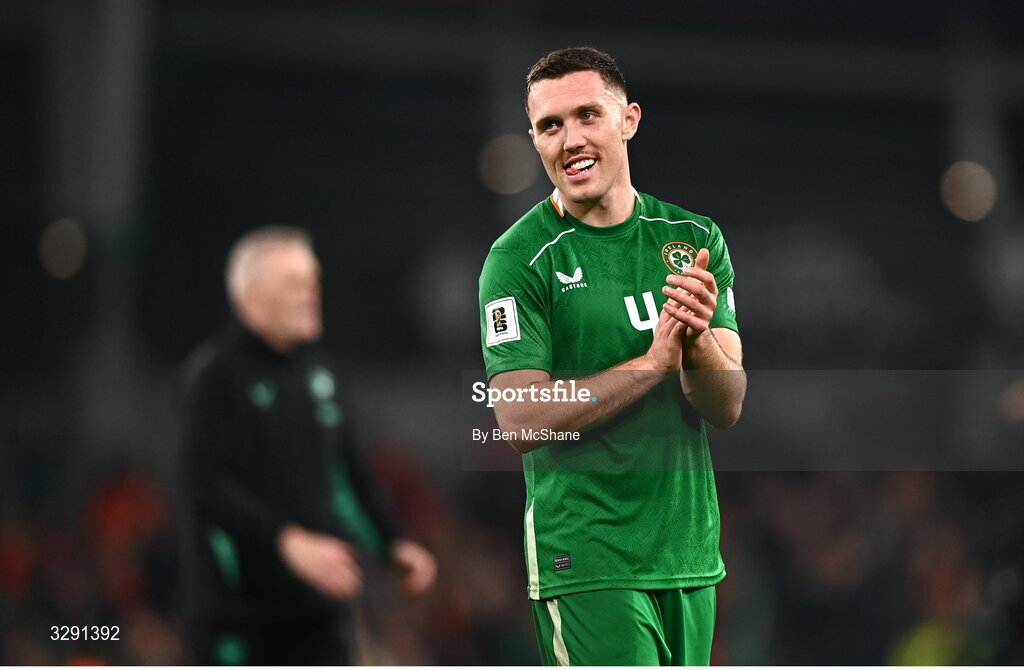 13 November 2025; Dara O'Shea of Republic of Ireland after his side's victory the FIFA World Cup 2026 Group F Qualifier match between Republic of Ireland and Portugal at the Aviva Stadium in Dublin. Photo by Ben McShane/Sportsfile