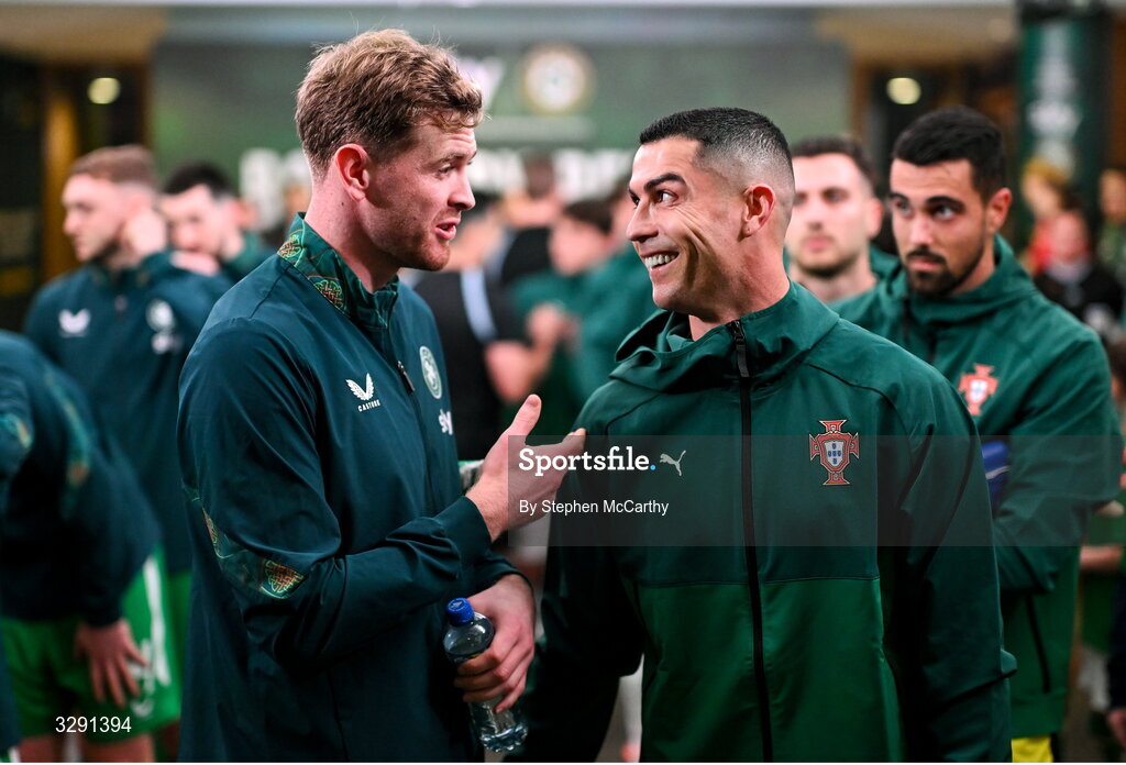 13 November 2025; Republic of Ireland captain Nathan Collins, left, and Portugal captain Cristiano Ronaldo before the FIFA World Cup 2026 Group F Qualifier match between Republic of Ireland and Portugal at the Aviva Stadium in Dublin. Photo by Stephen McCarthy/Sportsfile