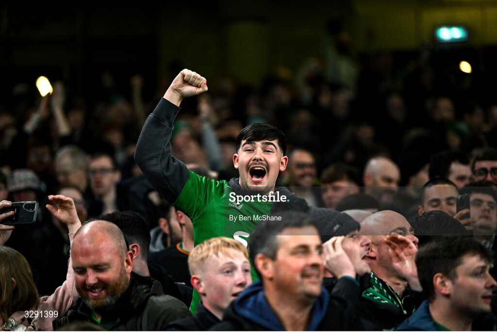 13 November 2025; A Republic of Ireland supporter celebrates his side's first goal during the FIFA World Cup 2026 Group F Qualifier match between Republic of Ireland and Portugal at the Aviva Stadium in Dublin. Photo by Ben McShane/Sportsfile