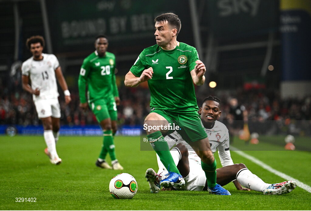 13 November 2025; Seamus Coleman of Republic of Ireland in action against Rafael Leao of Portugal during the FIFA World Cup 2026 Group F Qualifier match between Republic of Ireland and Portugal at the Aviva Stadium in Dublin. Photo by Ben McShane/Sportsfile