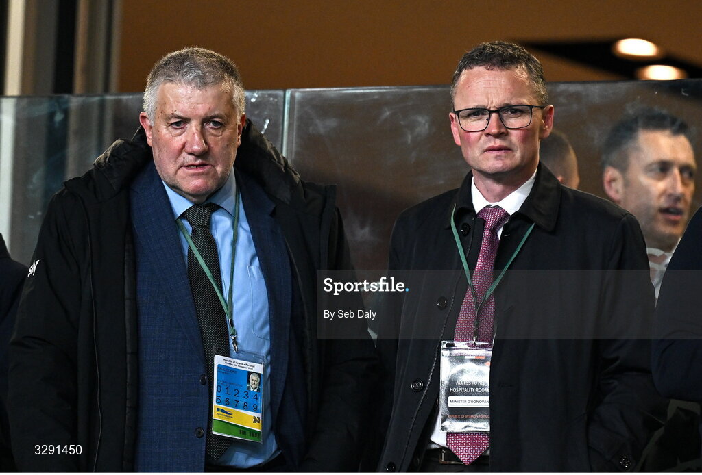 13 November 2025; FAI President Paul Cooke, left, and Minister for Arts, Media, Communications, Culture and Sport Patrick O'Donovan TD before the FIFA World Cup 2026 Qualifier match between Republic of Ireland and Portugal at the Aviva Stadium in Dublin. Photo by Seb Daly/Sportsfile