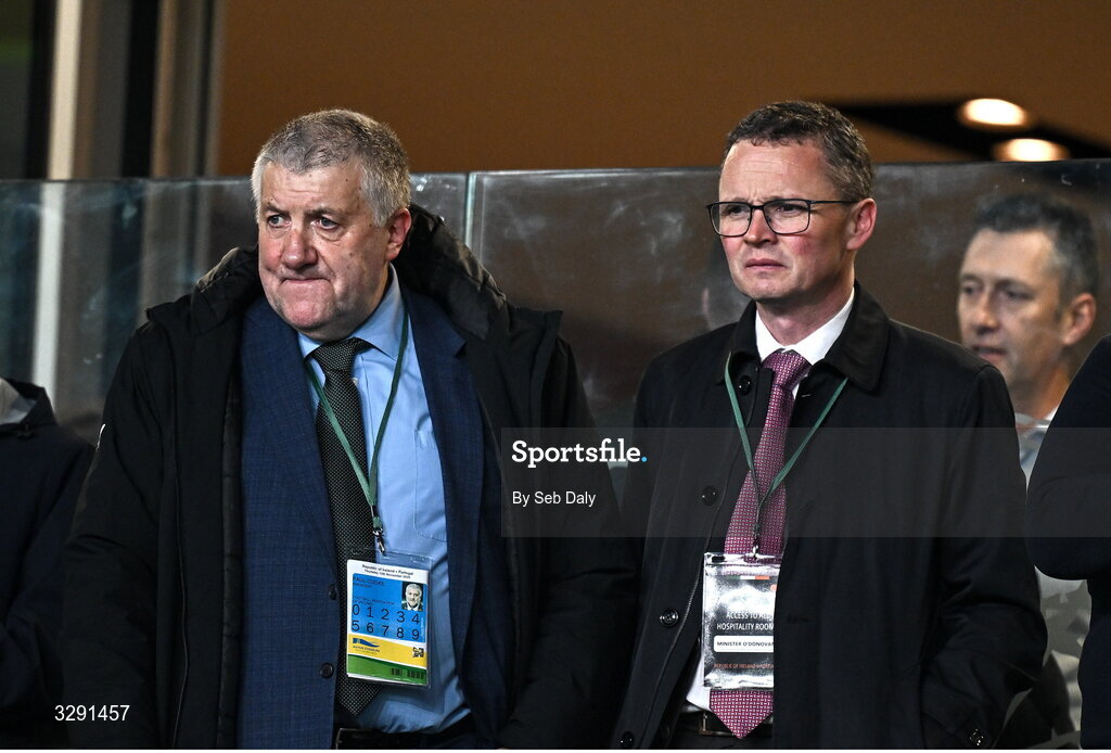 13 November 2025; FAI President Paul Cooke, left, and Minister for Arts, Media, Communications, Culture and Sport Patrick O'Donovan TD before the FIFA World Cup 2026 Qualifier match between Republic of Ireland and Portugal at the Aviva Stadium in Dublin. Photo by Seb Daly/Sportsfile