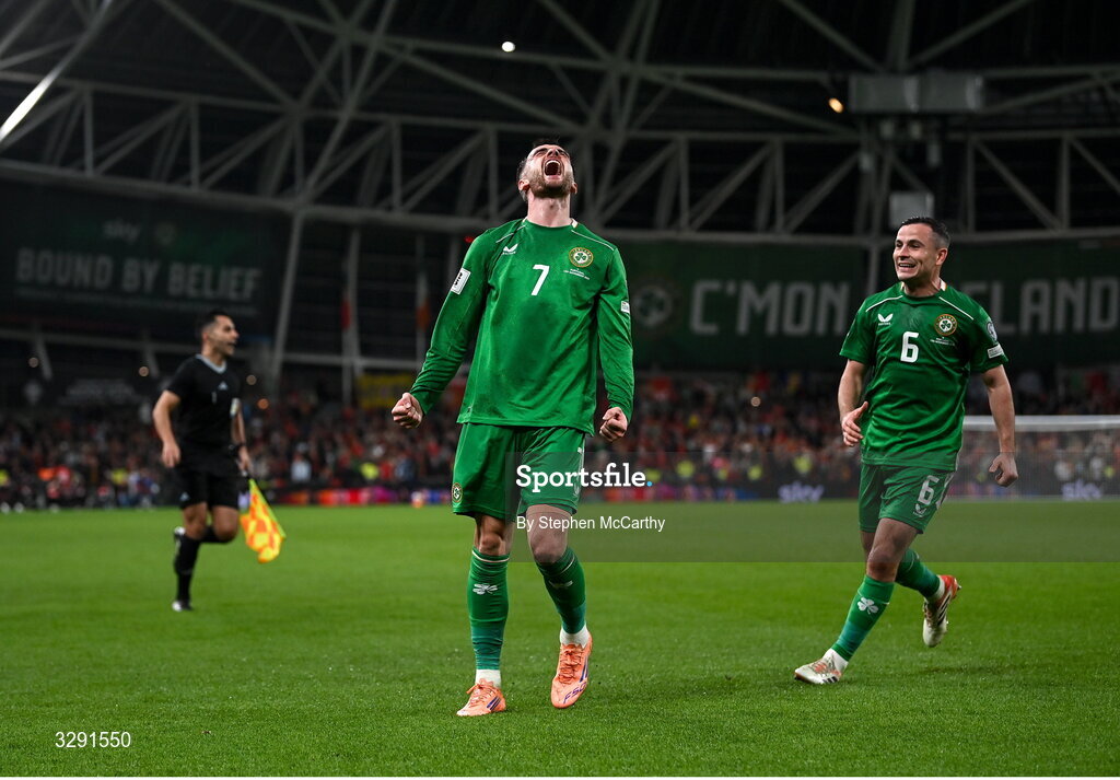 13 November 2025; Troy Parrott of Republic of Ireland celebrates after scoring his side's second goal during the FIFA World Cup 2026 Group F Qualifier match between Republic of Ireland and Portugal at the Aviva Stadium in Dublin. Photo by Stephen McCarthy/Sportsfile