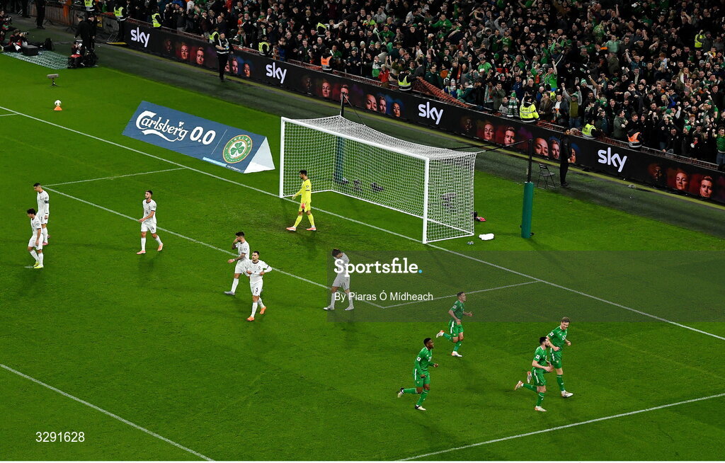 13 November 2025; Portugal and Republic of Ireland players react after Troy Parrott of Republic of Ireland, not pictured, scored his side's first goal during the FIFA World Cup 2026 Group F Qualifier match between Republic of Ireland and Portugal at the Aviva Stadium in Dublin. Photo by Piaras Ó Mídheach/Sportsfile