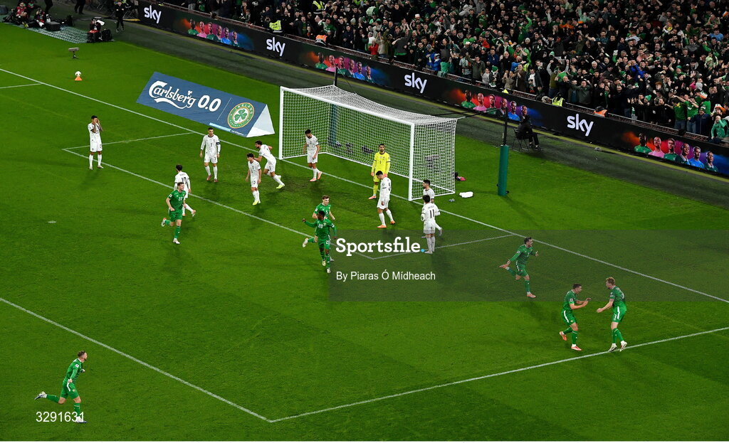 13 November 2025; Troy Parrott of Republic of Ireland, third from right, celebrates scoring his side's first goal during the FIFA World Cup 2026 Group F Qualifier match between Republic of Ireland and Portugal at the Aviva Stadium in Dublin. Photo by Piaras Ó Mídheach/Sportsfile