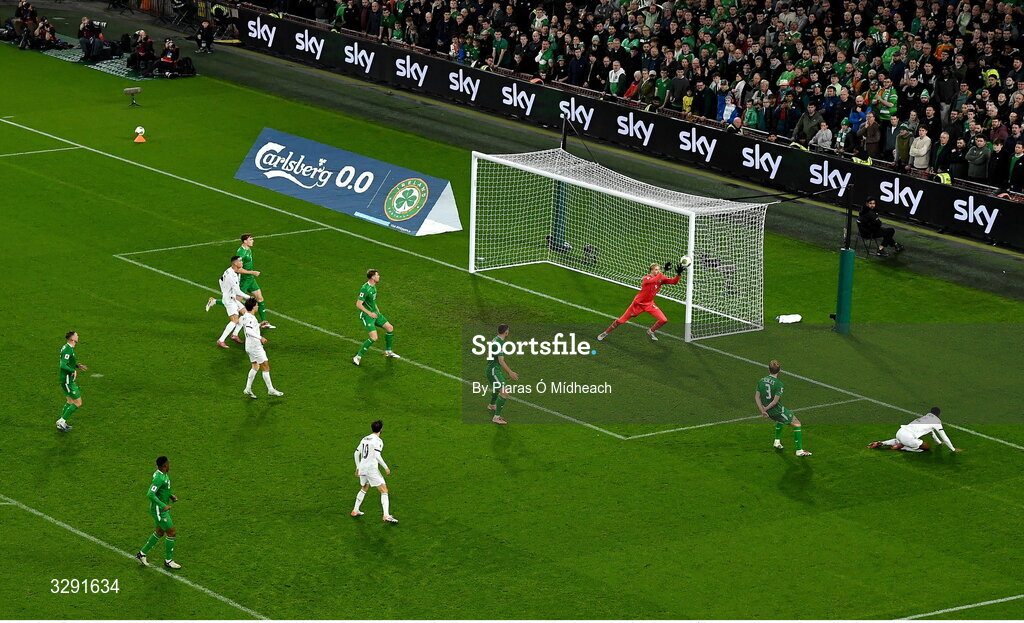13 November 2025; Republic of Ireland goalkeeper Caoimhin Kelleher makes a save during the FIFA World Cup 2026 Group F Qualifier match between Republic of Ireland and Portugal at the Aviva Stadium in Dublin. Photo by Piaras Ó Mídheach/Sportsfile