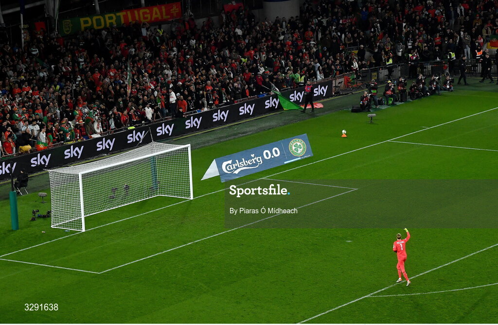 13 November 2025; Republic of Ireland goalkeeper Caoimhin Kelleher celebrates his side's first goal, scored by team-mate Troy Parrott, during the FIFA World Cup 2026 Group F Qualifier match between Republic of Ireland and Portugal at the Aviva Stadium in Dublin. Photo by Piaras Ó Mídheach/Sportsfile