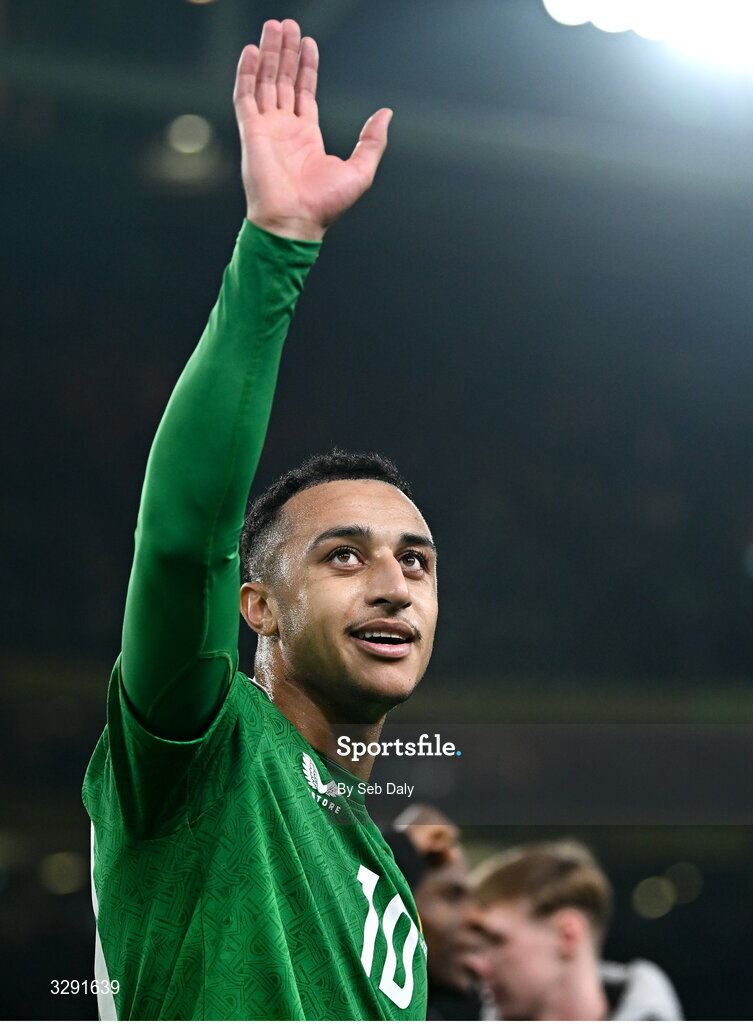 13 November 2025; Adam Idah of Republic of Ireland after the FIFA World Cup 2026 Qualifier match between Republic of Ireland and Portugal at the Aviva Stadium in Dublin. Photo by Seb Daly/Sportsfile