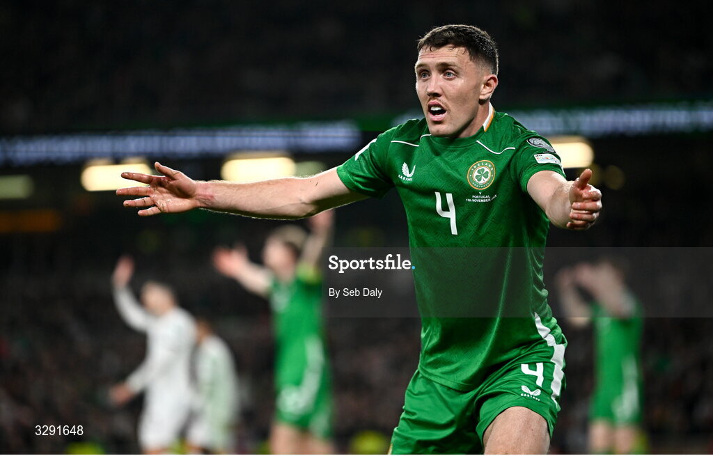 13 November 2025; Dara O'Shea of Republic of Ireland reacts during the FIFA World Cup 2026 Qualifier match between Republic of Ireland and Portugal at the Aviva Stadium in Dublin. Photo by Seb Daly/Sportsfile