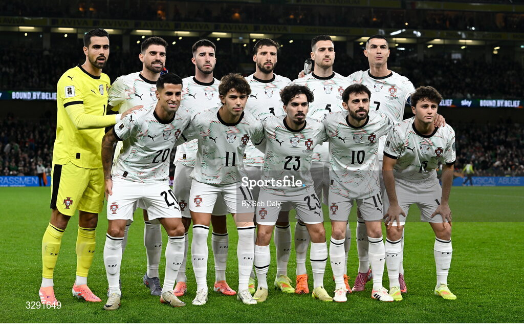 13 November 2025; The Portugal team, back row from left, goalkeeper Diogo Costa, Rúben Neves, Goncalo Inácio, Rúben Dias, Diogo Dalot and Cristiano Ronaldo, front row from left, Joao Cancelo, Joao Félix, Vitinha, Bernardo Silva and Joao Neves, before the FIFA World Cup 2026 Qualifier match between Republic of Ireland and Portugal at the Aviva Stadium in Dublin. Photo by Seb Daly/Sportsfile