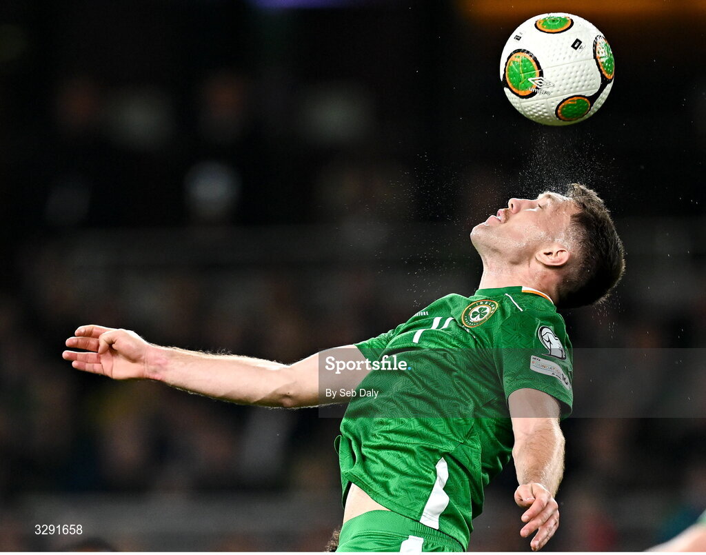 13 November 2025; Dara O'Shea of Republic of Ireland during the FIFA World Cup 2026 Qualifier match between Republic of Ireland and Portugal at the Aviva Stadium in Dublin. Photo by Seb Daly/Sportsfile