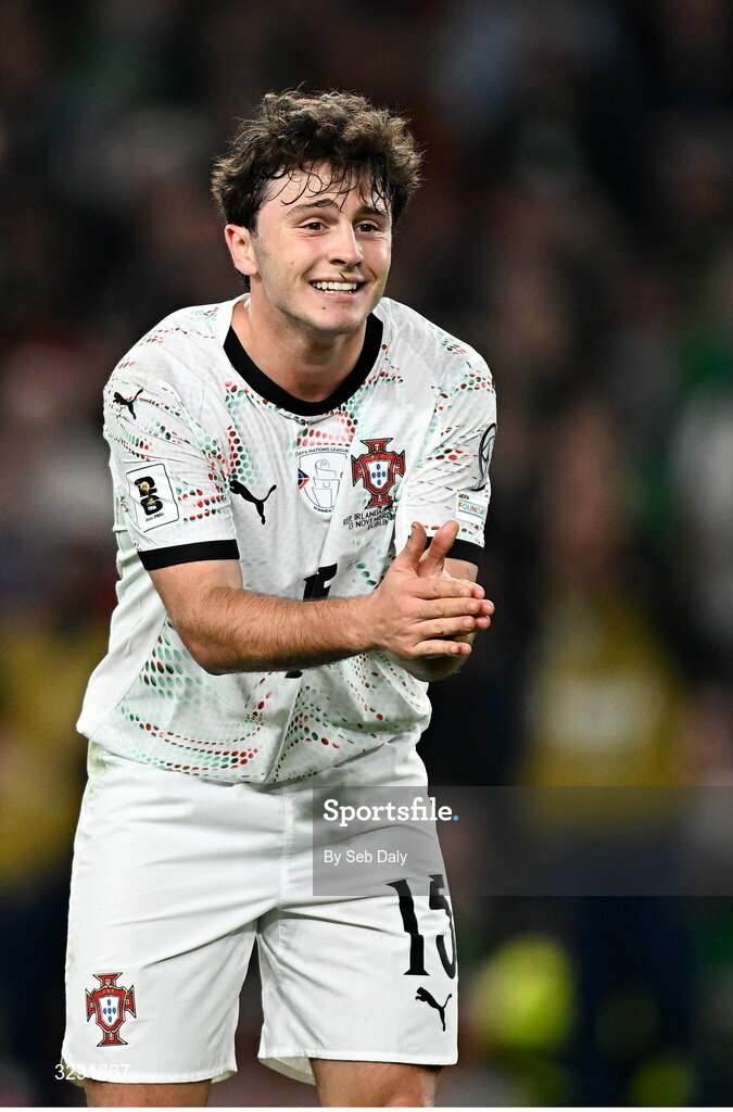 13 November 2025; Joao Neves of Portugal reacts during the FIFA World Cup 2026 Qualifier match between Republic of Ireland and Portugal at the Aviva Stadium in Dublin. Photo by Seb Daly/Sportsfile