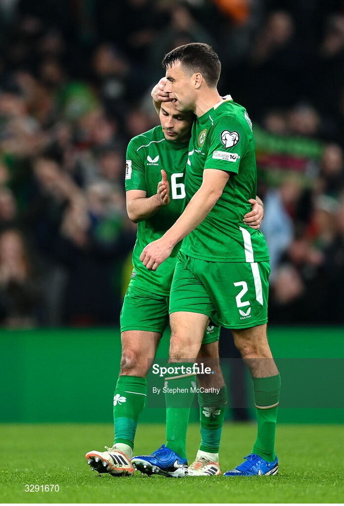 13 November 2025; Republic of Ireland's Josh Cullen, left, and Seamus Coleman after the FIFA World Cup 2026 Group F Qualifier match between Republic of Ireland and Portugal at the Aviva Stadium in Dublin. Photo by Stephen McCarthy/Sportsfile