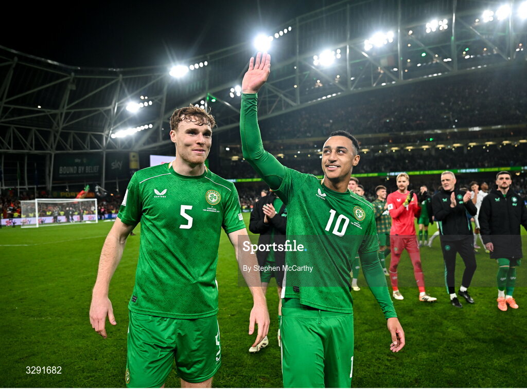 13 November 2025; Adam Idah and Jake O'Brien, left, of Republic of Ireland after the FIFA World Cup 2026 Group F Qualifier match between Republic of Ireland and Portugal at the Aviva Stadium in Dublin. Photo by Stephen McCarthy/Sportsfile