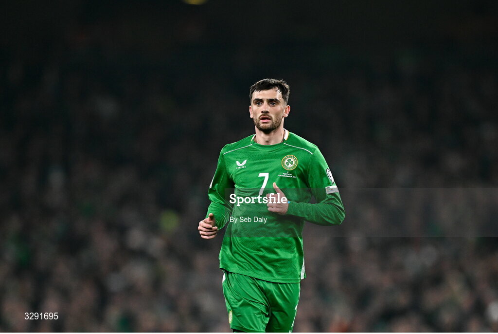 13 November 2025; Troy Parrott of Republic of Irelans during the FIFA World Cup 2026 Qualifier match between Republic of Ireland and Portugal at the Aviva Stadium in Dublin. Photo by Seb Daly/Sportsfile