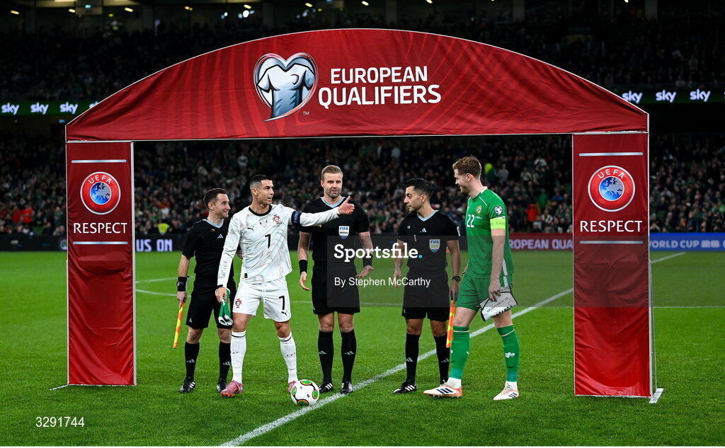 13 November 2025; Portugal captain Cristiano Ronaldo and Republic of Ireland captain Nathan Collins before the FIFA World Cup 2026 Group F Qualifier match between Republic of Ireland and Portugal at the Aviva Stadium in Dublin. Photo by Stephen McCarthy/Sportsfile