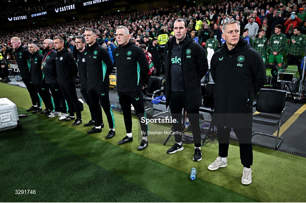 13 November 2025; Republic of Ireland head coach Heimir Hallgrimsson, right, with staff, from right, assistant head coach John O'Shea, goalkeeping coach Gudmundur Hreidarsson, head of athletic performance Damien Doyle, team doctor Sean Carmody, lead physiotherapist Danny Miller, kit and equipment manager Karl McKenna, physiotherapist Cian McCaffrey and StatSport analyst Adam Fox before the FIFA World Cup 2026 Group F Qualifier match between Republic of Ireland and Portugal at the Aviva Stadium in Dublin. Photo by Stephen McCarthy/Sportsfile