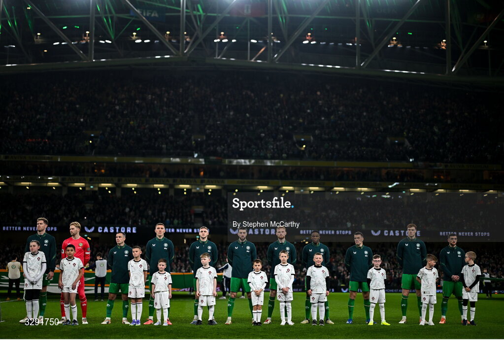 13 November 2025; Republic of Ireland players, from left, Nathan Collins, goalkeeper Caoimhin Kelleher, Josh Cullen, Dara O'Shea, Jack Taylor, Finn Azaz, Liam Scales, Chiedozie Ogbene, Seamus Coleman, Jake O'Brien and Troy Parrott before the FIFA World Cup 2026 Group F Qualifier match between Republic of Ireland and Portugal at the Aviva Stadium in Dublin. Photo by Stephen McCarthy/Sportsfile