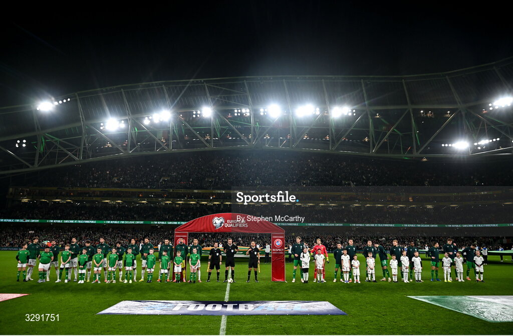 13 November 2025; Teams and officials line up before the FIFA World Cup 2026 Group F Qualifier match between Republic of Ireland and Portugal at the Aviva Stadium in Dublin. Photo by Stephen McCarthy/Sportsfile