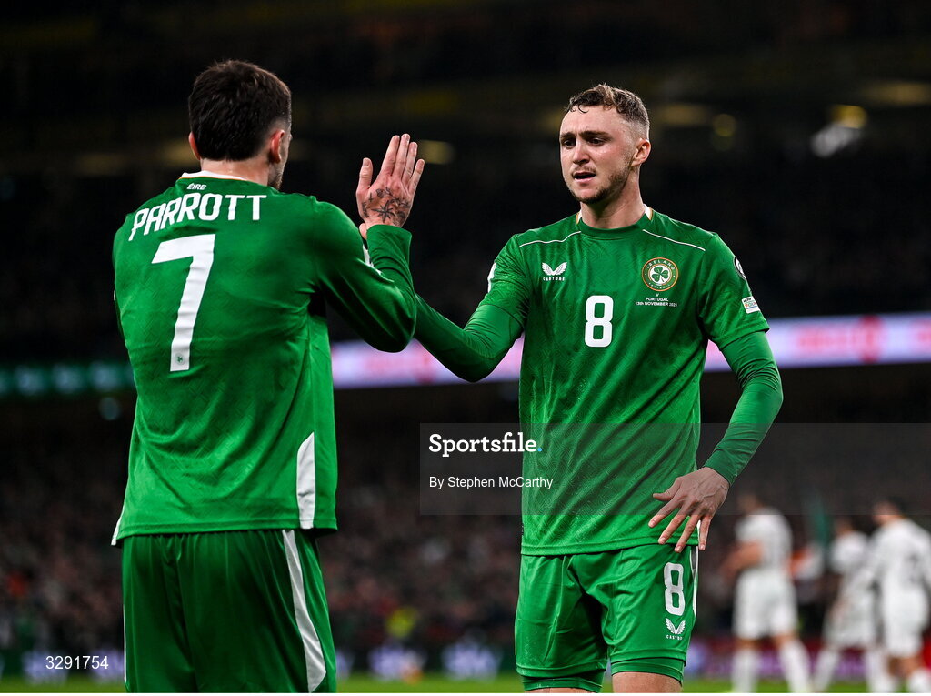 13 November 2025; Troy Parrott of Republic of Ireland is congratulated by team-mate Jack Taylor, right, after scoring their side's second goal during the FIFA World Cup 2026 Group F Qualifier match between Republic of Ireland and Portugal at the Aviva Stadium in Dublin. Photo by Stephen McCarthy/Sportsfile