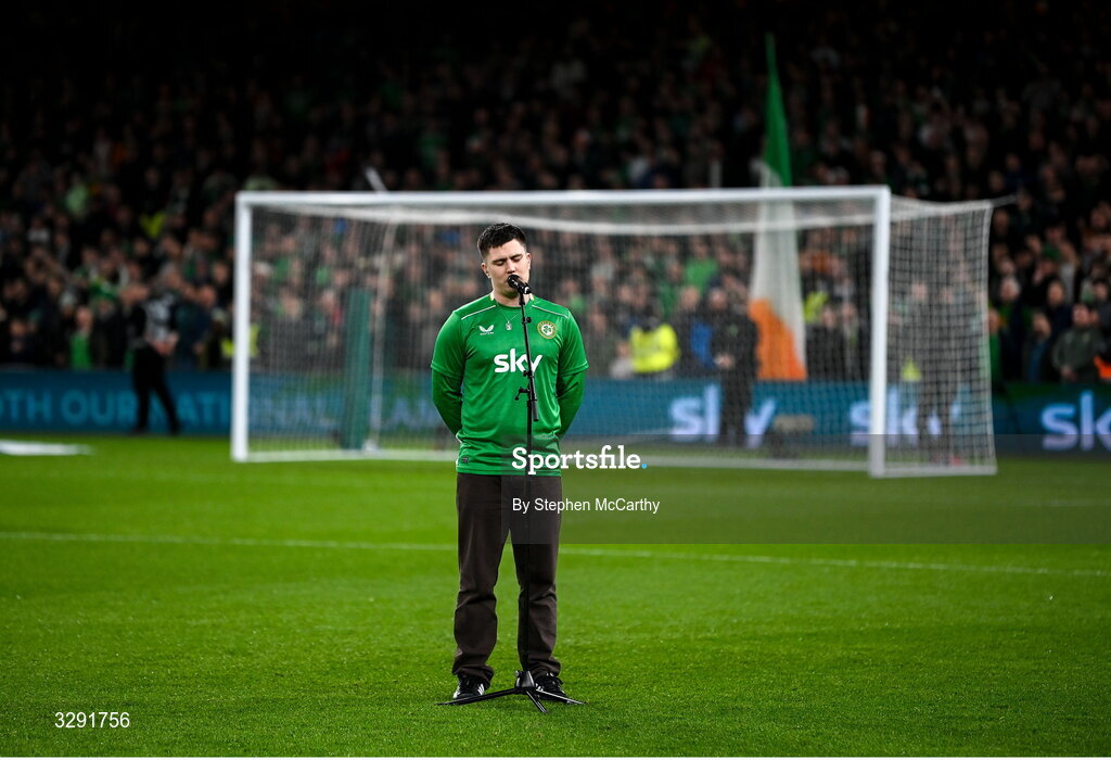 13 November 2025; Aaron Rowe sings Amhrán na bhFiann before the FIFA World Cup 2026 Group F Qualifier match between Republic of Ireland and Portugal at the Aviva Stadium in Dublin. Photo by Stephen McCarthy/Sportsfile