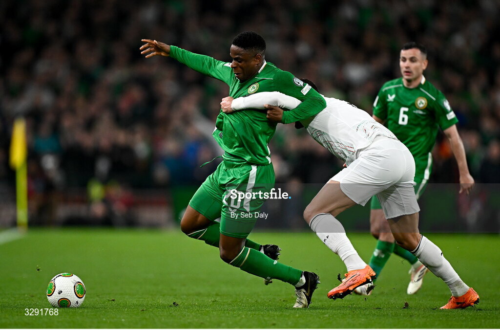 13 November 2025; Chiedozie Ogbene of Republic of Ireland in action against Diogo Dalot of Portugal during the FIFA World Cup 2026 Qualifier match between Republic of Ireland and Portugal at the Aviva Stadium in Dublin. Photo by Seb Daly/Sportsfile