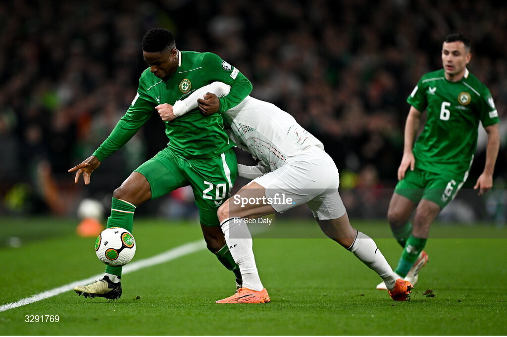 13 November 2025; Chiedozie Ogbene of Republic of Ireland in action against Diogo Dalot of Portugal during the FIFA World Cup 2026 Qualifier match between Republic of Ireland and Portugal at the Aviva Stadium in Dublin. Photo by Seb Daly/Sportsfile