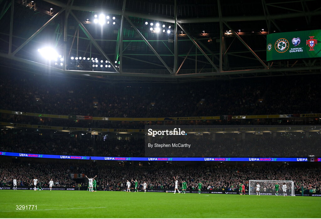 13 November 2025; A general view of the action inside the stadium featuring EURO 2028 branding during the FIFA World Cup 2026 Group F Qualifier match between Republic of Ireland and Portugal at the Aviva Stadium in Dublin. Photo by Stephen McCarthy/Sportsfile