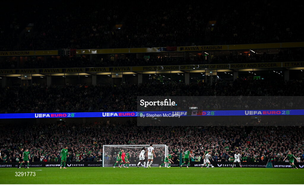 13 November 2025; A general view of the action inside the stadium featuring EURO 2028 branding during the FIFA World Cup 2026 Group F Qualifier match between Republic of Ireland and Portugal at the Aviva Stadium in Dublin. Photo by Stephen McCarthy/Sportsfile