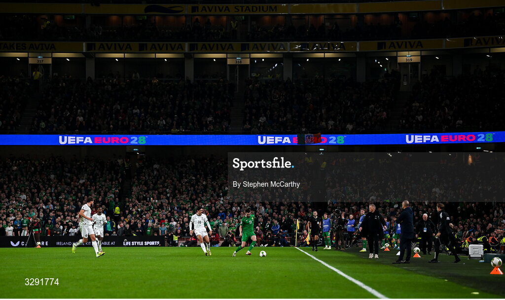 13 November 2025; A general view of the action inside the stadium featuring EURO 2028 branding during the FIFA World Cup 2026 Group F Qualifier match between Republic of Ireland and Portugal at the Aviva Stadium in Dublin. Photo by Stephen McCarthy/Sportsfile