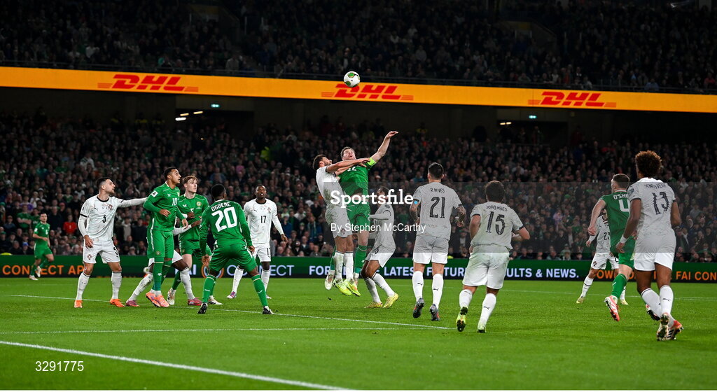 13 November 2025; Nathan Collins of Republic of Ireland in action against Rúben Dias of Portugal during the FIFA World Cup 2026 Group F Qualifier match between Republic of Ireland and Portugal at the Aviva Stadium in Dublin. Photo by Stephen McCarthy/Sportsfile