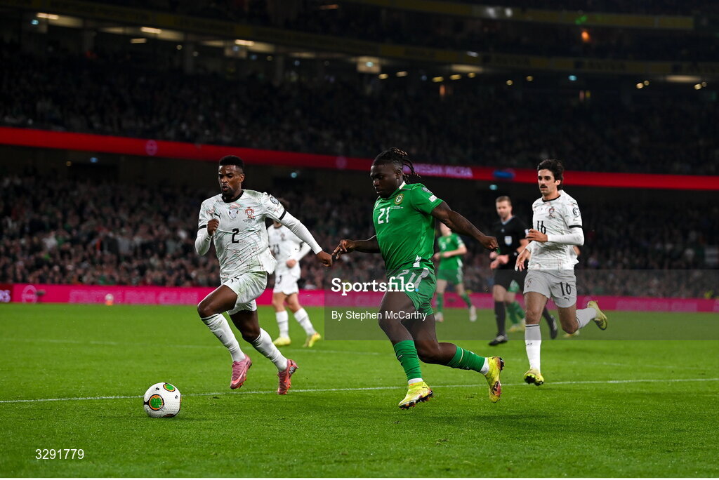 13 November 2025; Festy Ebosele of Republic of Ireland during the FIFA World Cup 2026 Group F Qualifier match between Republic of Ireland and Portugal at the Aviva Stadium in Dublin. Photo by Stephen McCarthy/Sportsfile