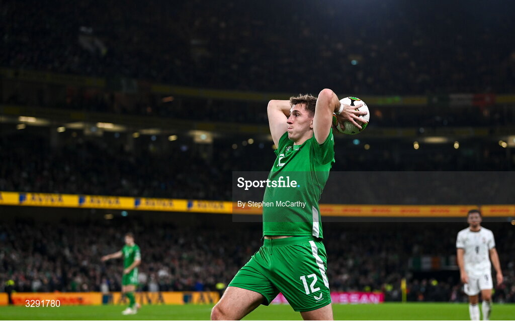13 November 2025; Jimmy Dunne of Republic of Ireland prepares to take a throw-in during the FIFA World Cup 2026 Group F Qualifier match between Republic of Ireland and Portugal at the Aviva Stadium in Dublin. Photo by Stephen McCarthy/Sportsfile