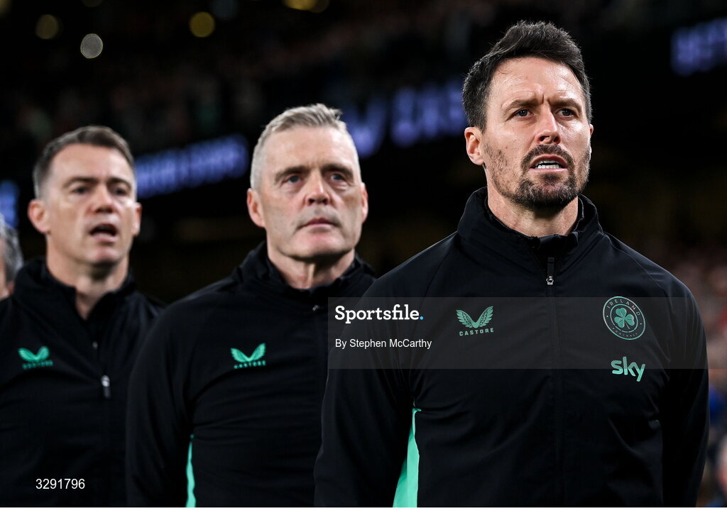 13 November 2025; Republic of Ireland assistant coach Paddy McCarthy stands for the playing of the National Anthem before the FIFA World Cup 2026 Group F Qualifier match between Republic of Ireland and Portugal at the Aviva Stadium in Dublin. Photo by Stephen McCarthy/Sportsfile
