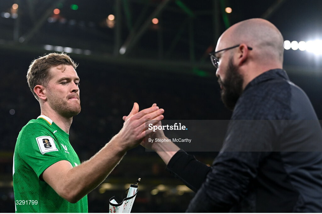 13 November 2025; Nathan Collins of Republic of Ireland and kit and equipment manager Karl McKenna before the FIFA World Cup 2026 Group F Qualifier match between Republic of Ireland and Portugal at the Aviva Stadium in Dublin. Photo by Stephen McCarthy/Sportsfile