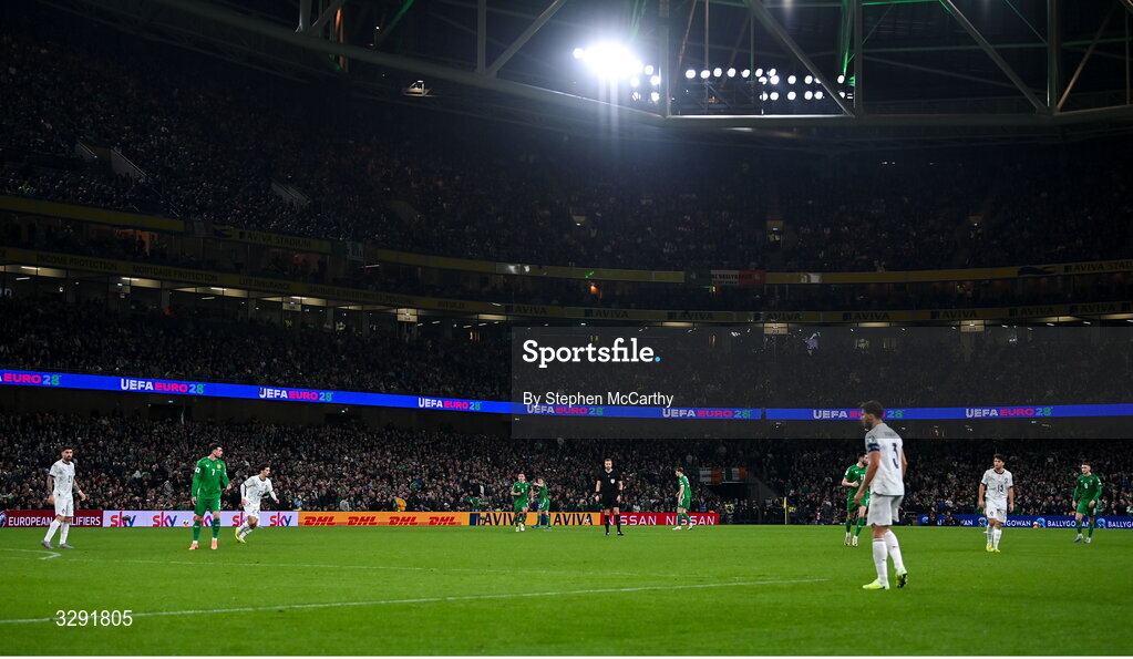 13 November 2025; A general view of the action inside the stadium featuring EURO 2028 branding during the FIFA World Cup 2026 Group F Qualifier match between Republic of Ireland and Portugal at the Aviva Stadium in Dublin. Photo by Stephen McCarthy/Sportsfile