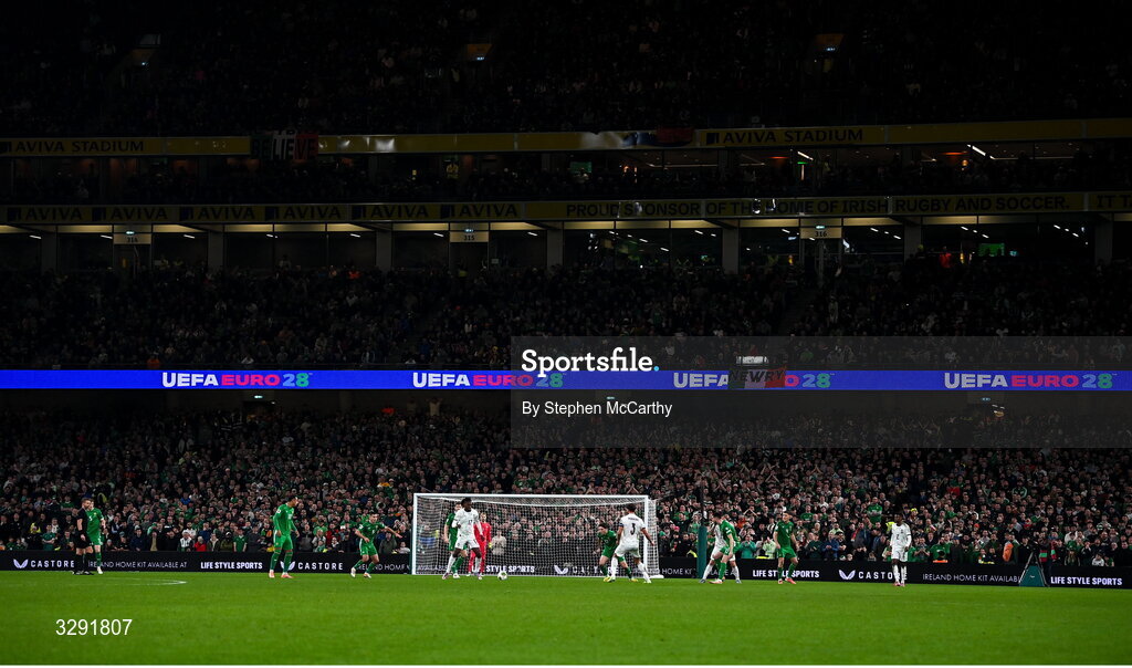 13 November 2025; A general view of the action inside the stadium featuring EURO 2028 branding during the FIFA World Cup 2026 Group F Qualifier match between Republic of Ireland and Portugal at the Aviva Stadium in Dublin. Photo by Stephen McCarthy/Sportsfile