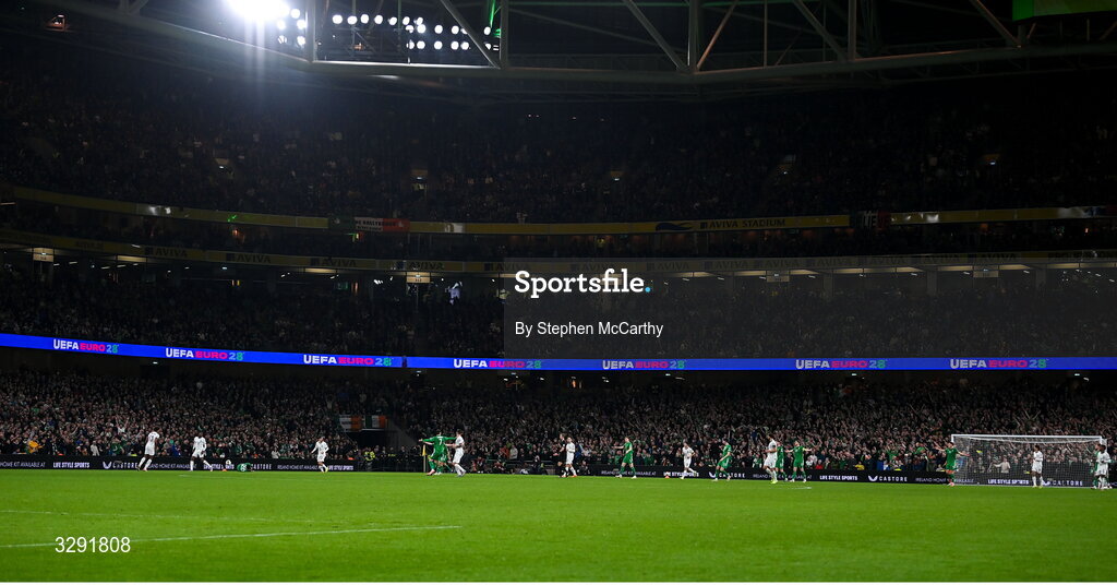 13 November 2025; A general view of the action inside the stadium featuring EURO 2028 branding during the FIFA World Cup 2026 Group F Qualifier match between Republic of Ireland and Portugal at the Aviva Stadium in Dublin. Photo by Stephen McCarthy/Sportsfile