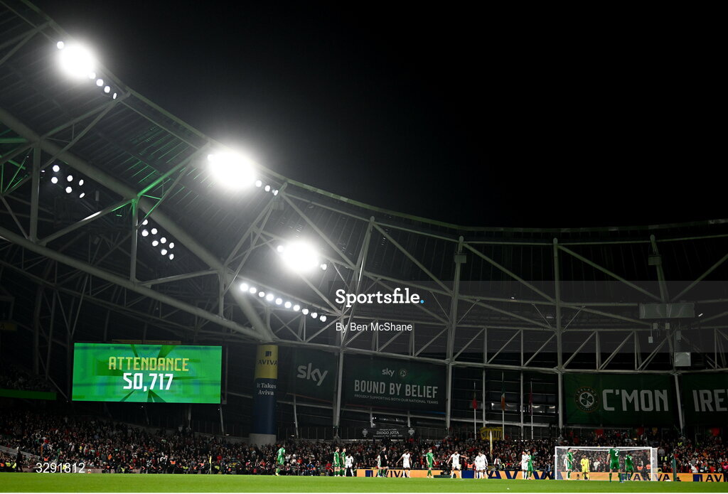 13 November 2025; The big screen displays the attendance of 50,717 during the FIFA World Cup 2026 Group F Qualifier match between Republic of Ireland and Portugal at the Aviva Stadium in Dublin. Photo by Ben McShane/Sportsfile