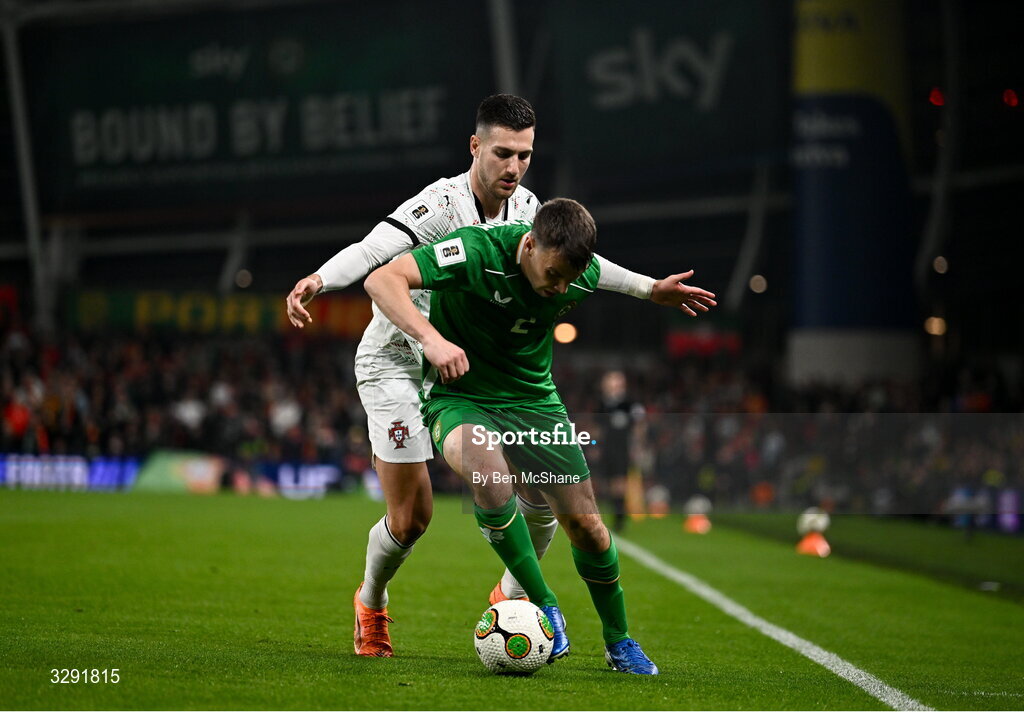 13 November 2025; Seamus Coleman of Republic of Ireland in action against Diogo Dalot of Portugal during the FIFA World Cup 2026 Group F Qualifier match between Republic of Ireland and Portugal at the Aviva Stadium in Dublin. Photo by Ben McShane/Sportsfile