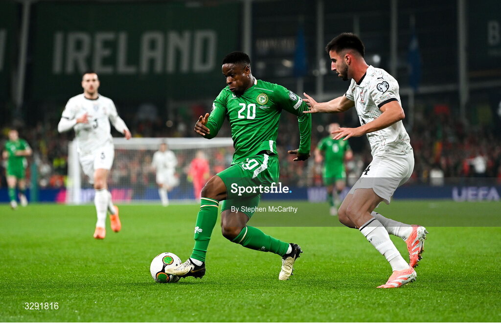 13 November 2025; Chiedozie Ogbene of Republic of Ireland in action against Goncalo Inácio of Portugal during the FIFA World Cup 2026 Group F Qualifier match between Republic of Ireland and Portugal at the Aviva Stadium in Dublin. Photo by Stephen McCarthy/Sportsfile